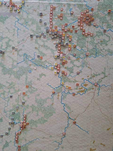 Germany feeling chastened after its boo-boo, just does one rail and six land moves. However von Bock flips the artillery and one of the FTRs